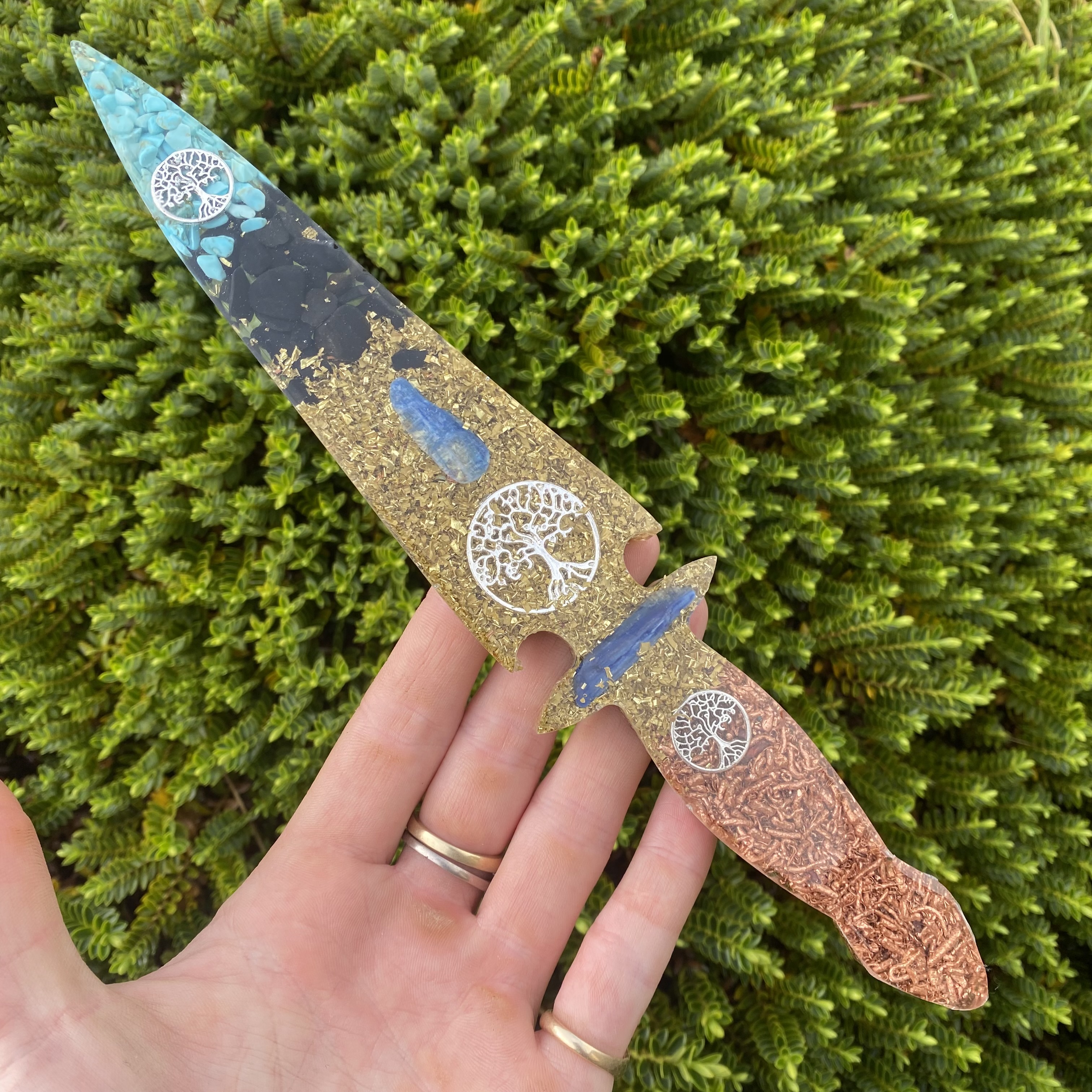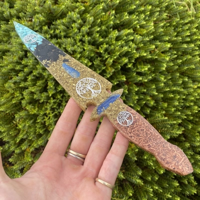 size 24cm long. We designed this knife especially for Therapists that need to cut any psychic cords or threads that a difficult to cut. This knife is super powerful and makes the whole process very easy for therapists. It is filled with reiki and healing energy. Contains, tourmaline, Kynaite, copper, brass, TREE of life and Turquoise