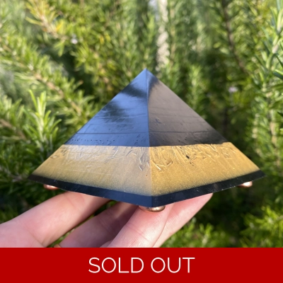 Size 9cm x9cm x9cm contains, shungite, tensor ring, kyanite, amethyst, quartz, selenite, tourmaline , copper feet and 24 carat gold.