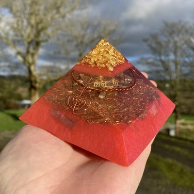Size 9cm x9cm x9cm approx 24 carat gold, 4 quarts point off quartz reiki pyramid with all reiki symbols, 2 Cho Ku Res copper coils, brass, amethyst, quarts hidden metals , single celtic coil, tensor ring iron filings. and titanium flame crystal of light.