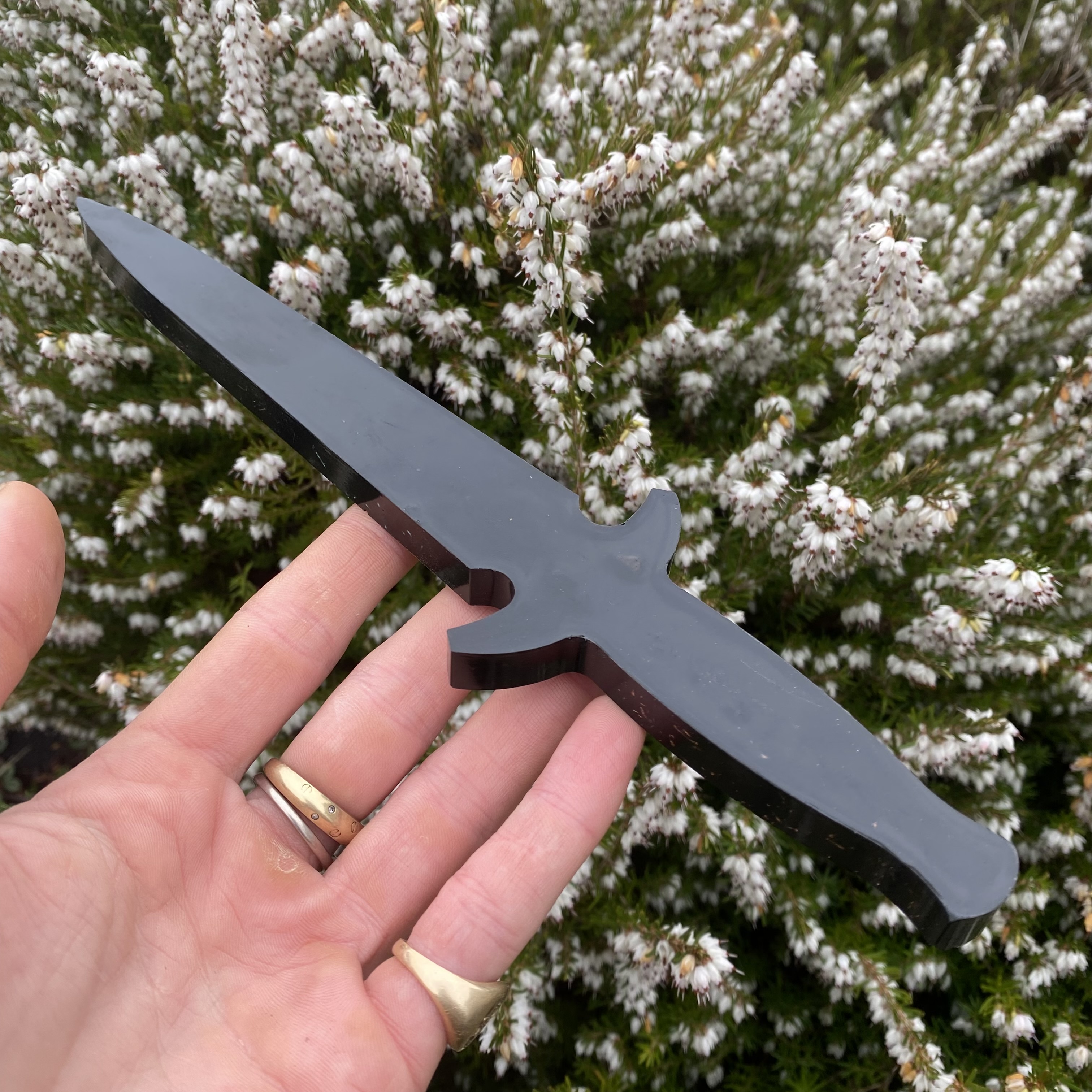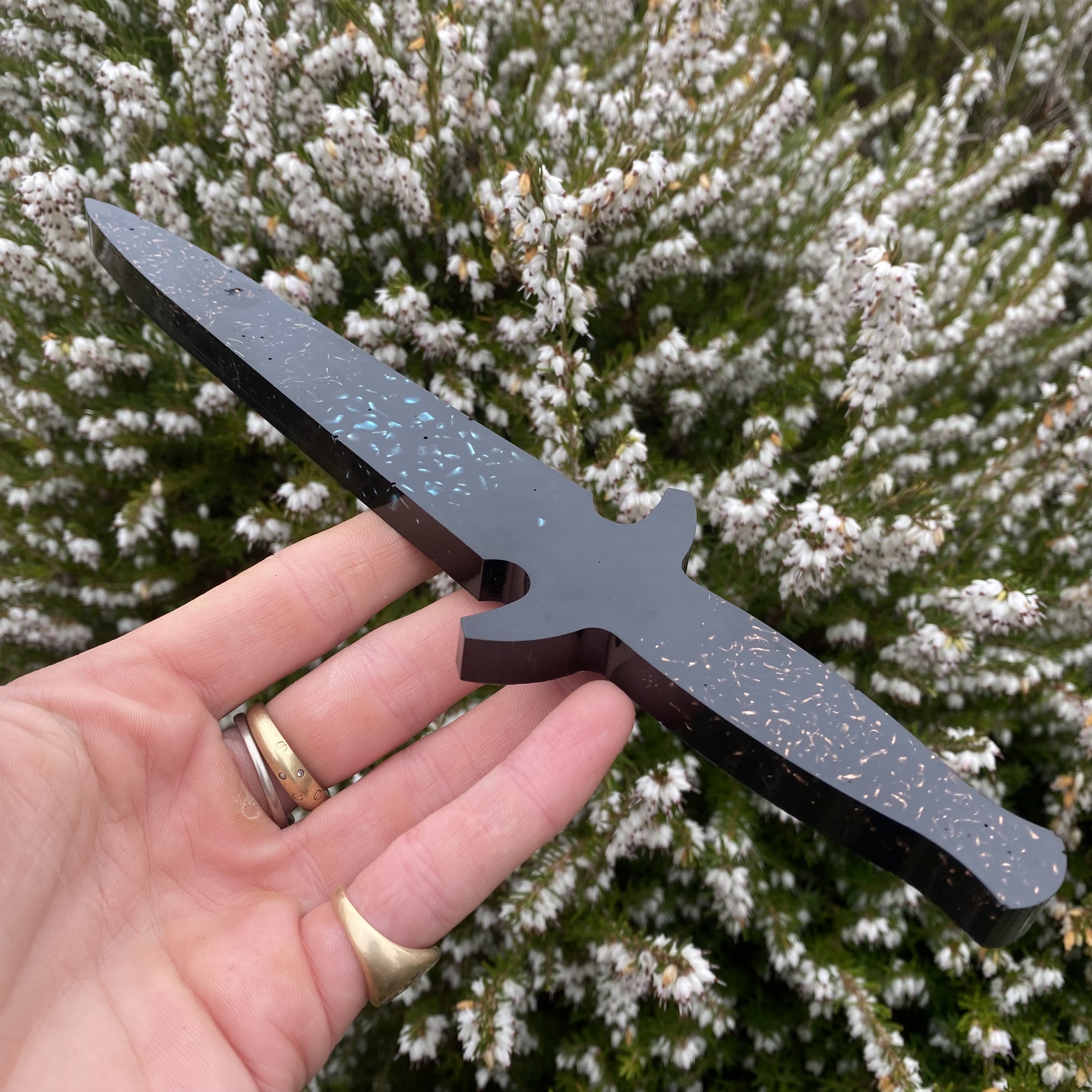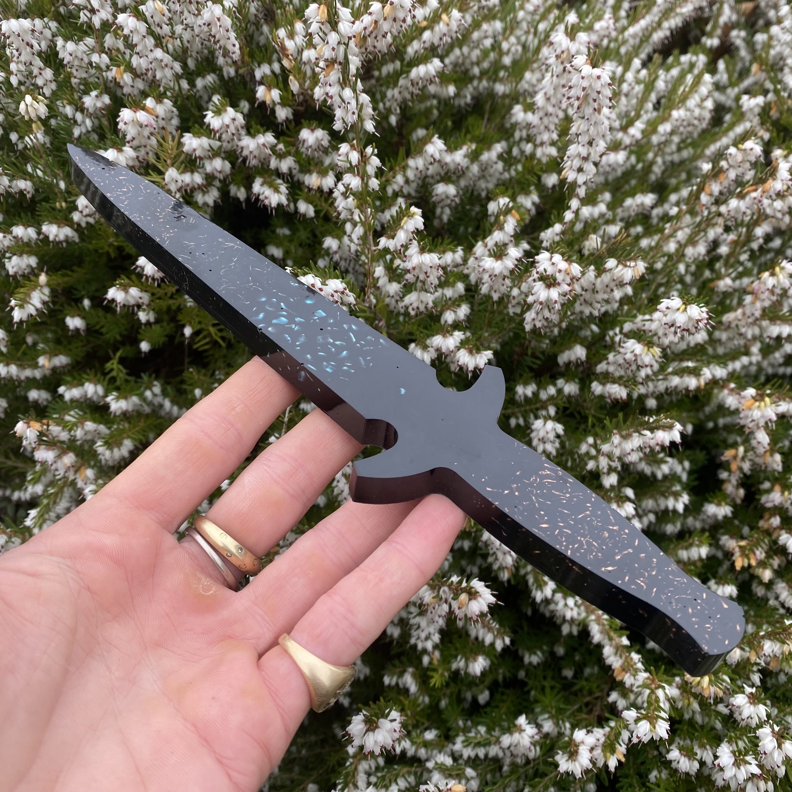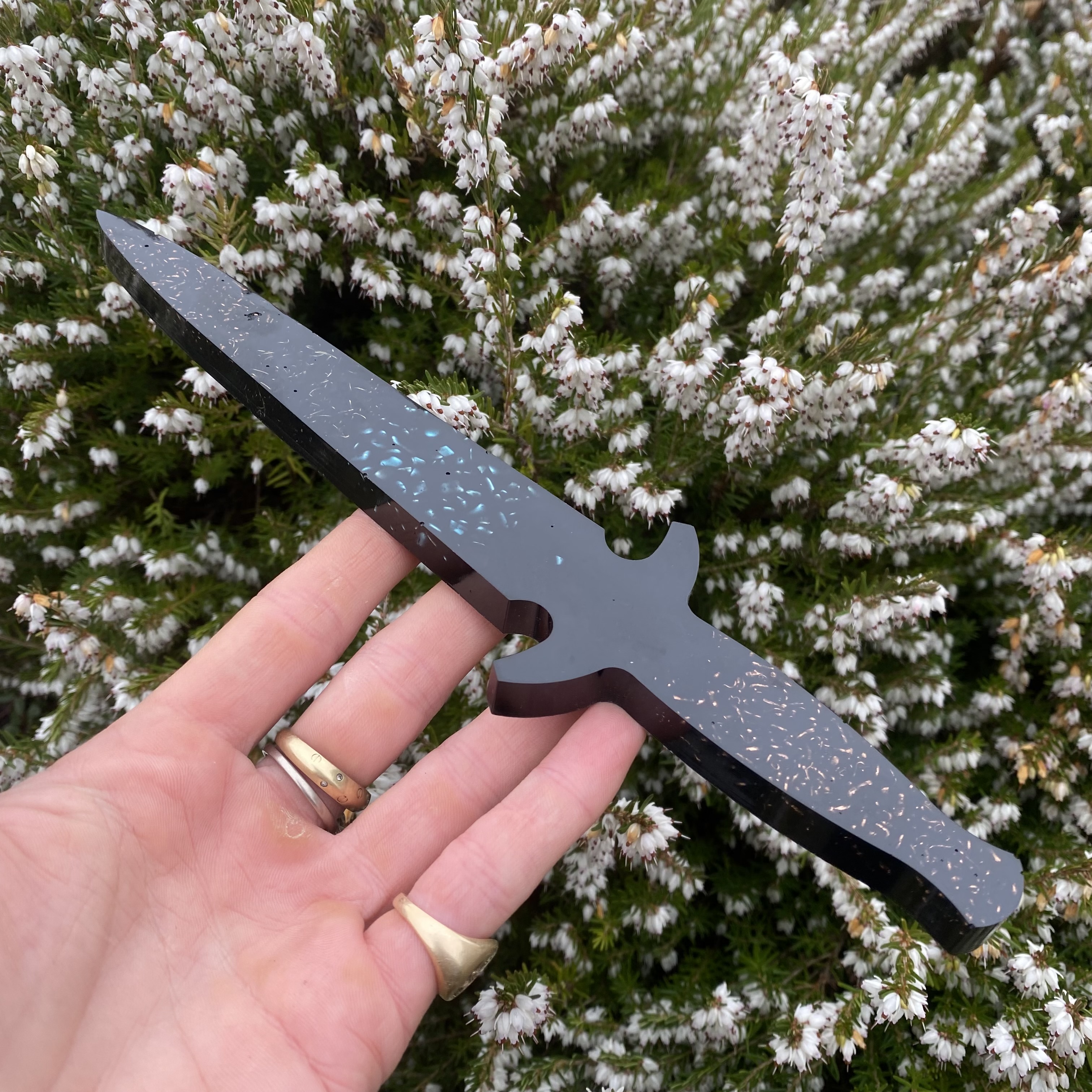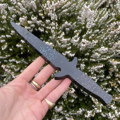 size 24cm long. We designed this knife especially for Therapists that need to cut any psychic cords or threads that a difficult to cut. This knife is super powerful and makes the whole process very easy for therapists. It is filled with reiki and healing energy. Contains, Shungite, magnetite, tourmaline, amethyst, copper, and Turquoise